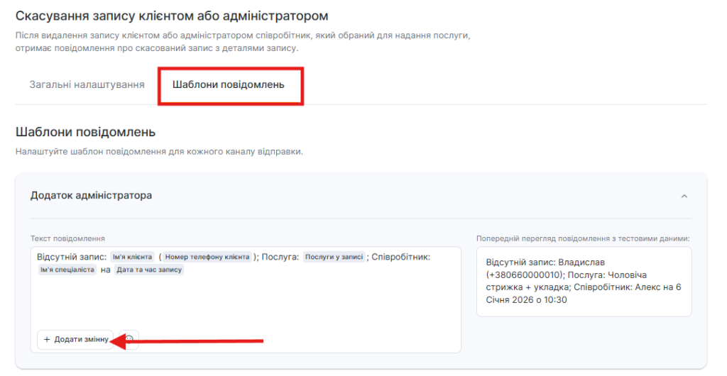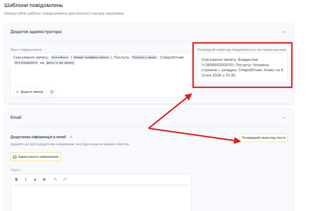 Для всіх шаблонів сповіщень доступний попередній перегляд — як виглядатиме повідомлення під час відправлення клієнту, співробітнику або адміністратору з урахуванням змінних.