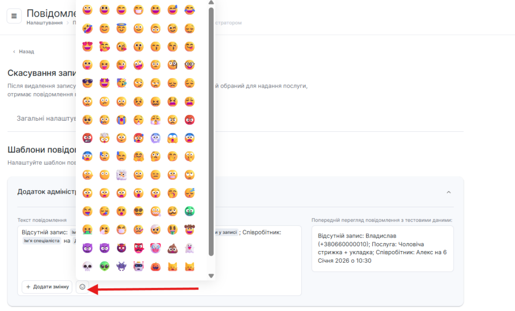 У SMS-шаблонах сповіщень ви можете використовувати Emoji, для цього натисніть кнопку зі смайлом і виберіть потрібний із запропонованих або додайте власний.