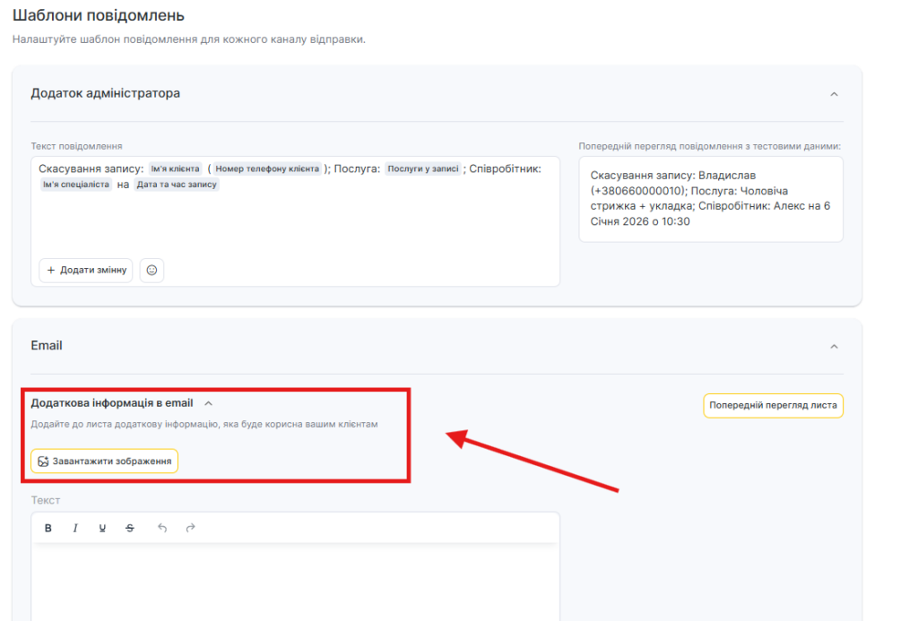 - Для каналу Email редагування шаблону недоступне, але можна додати додаткову інформацію. Для цього:
