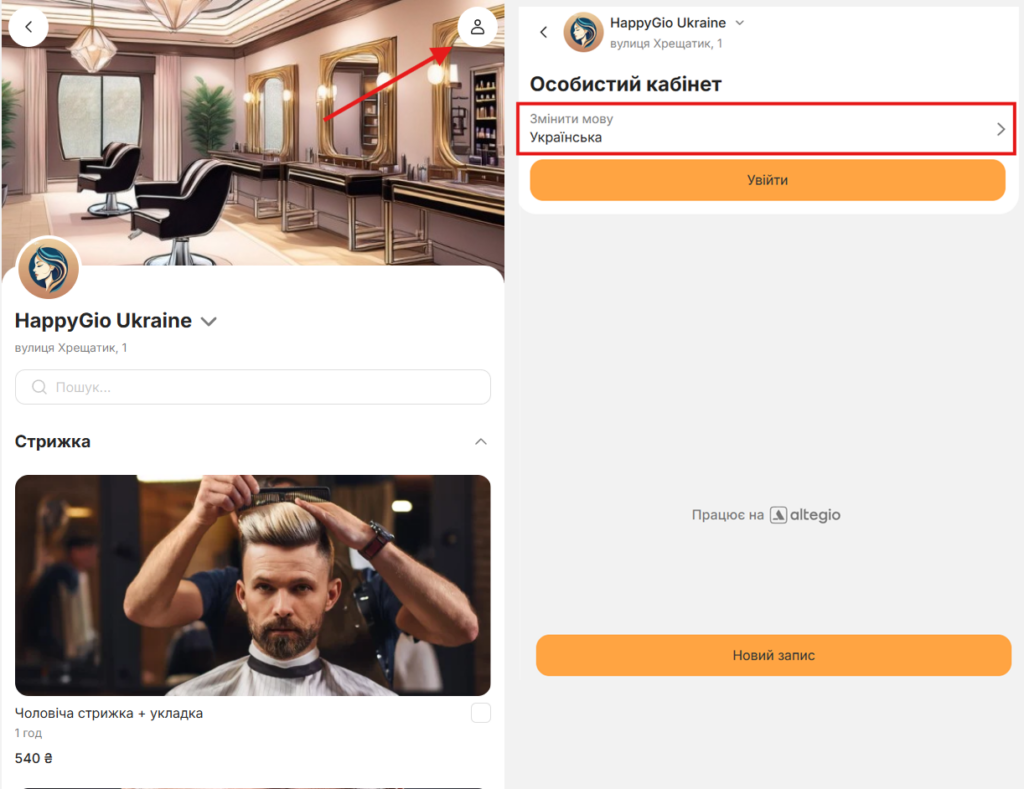 Можливість вибору мови доступна безпосередньо у віджеті онлайн-запису. Для цього потрібно перейти до Особистого кабінету, натиснувши на іконку профілю 👤 у правому верхньому куті екрана, і натиснути кнопку Змінити мову.