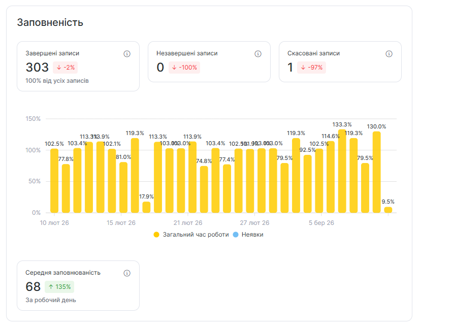 Середня заповненість — середній відсоток завантаження співробітників за робочий день. Розрахунок: Сумарна тривалість записів зі статусом «Клієнт прийшов» ÷ Цей показник допомагає зрозуміти, наскільки ефективно використовується робочий час команди.