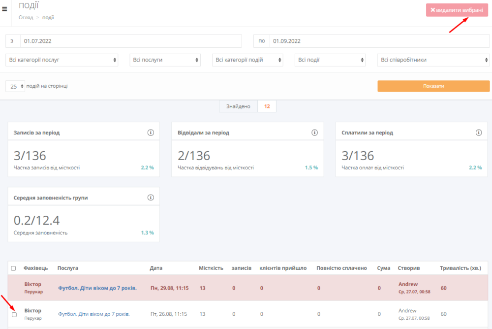 У розділі “Огляд” > “Події” представлена інформація щодо всіх подій (групових записів), які були зроблені у Altegio. Серед них події, створені будь-якими користувачами з правом створення запису, події з будь-яким статусом, а також віддалені події.