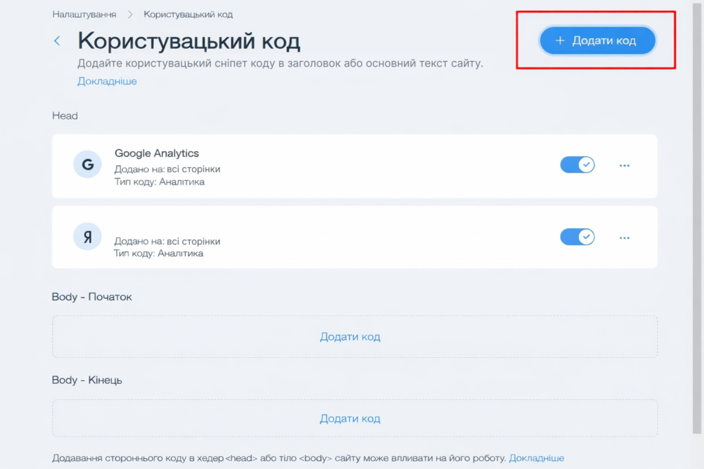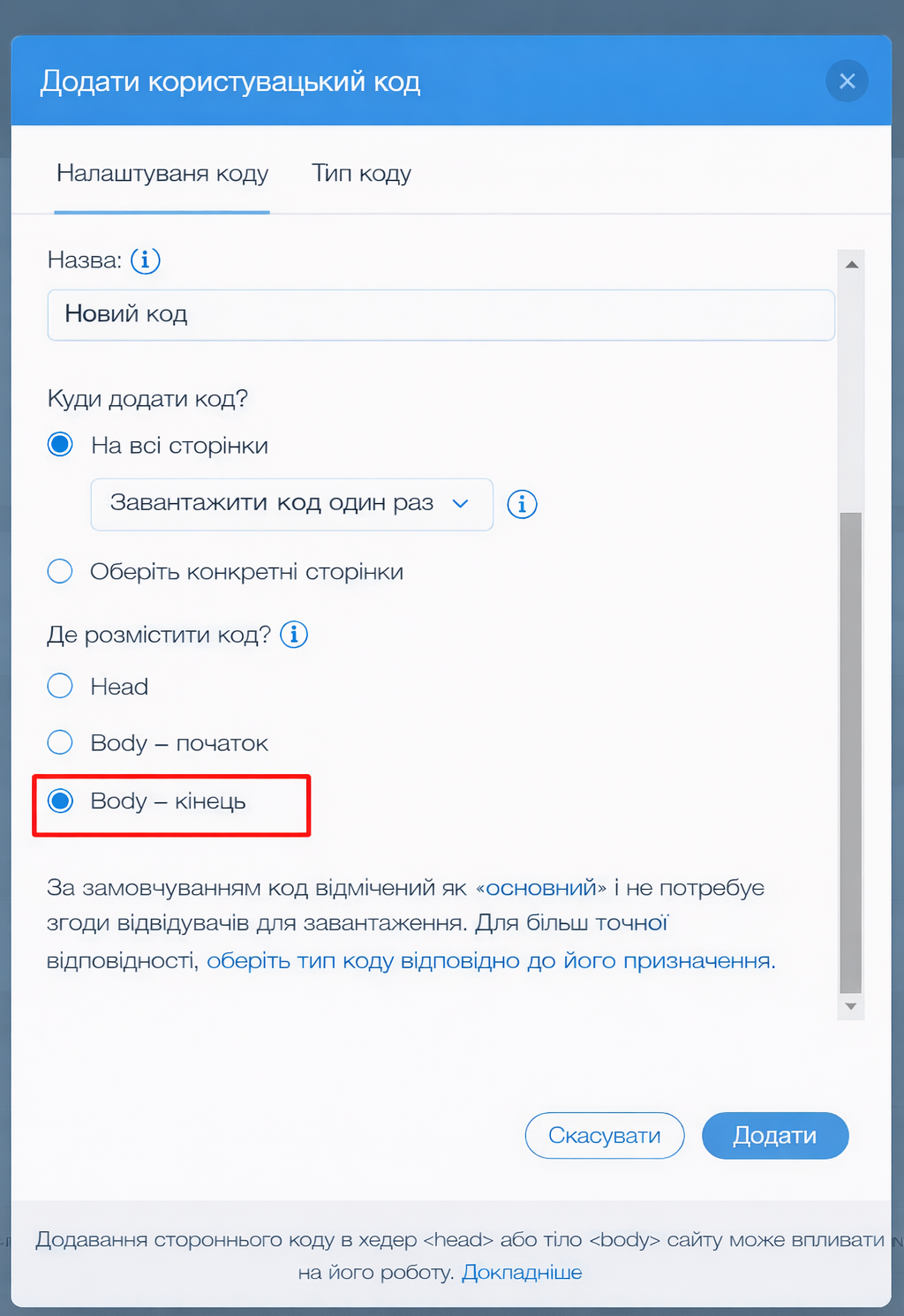 - У пункті Де розмістити код? вкажіть Body-кінець. Натисніть кнопку Додати.