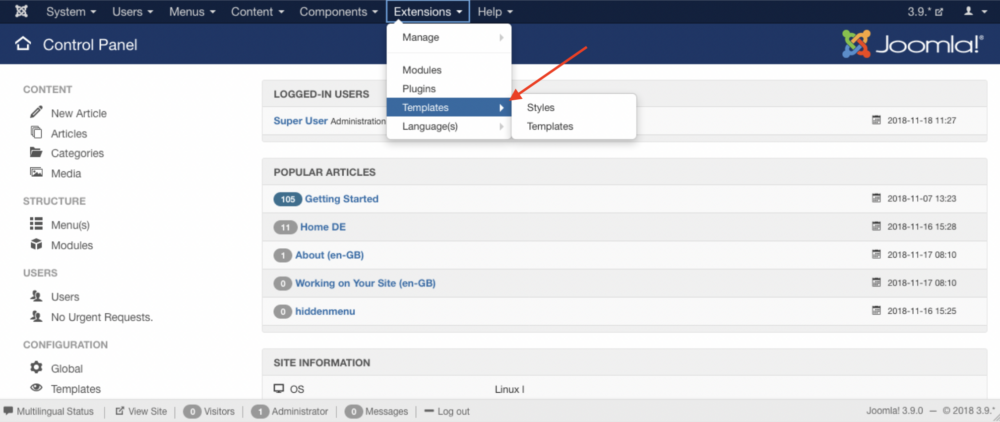 - У панелі керування перейдіть до розділу Розширення > Шаблони. Відкриється екран менеджера шаблонів.