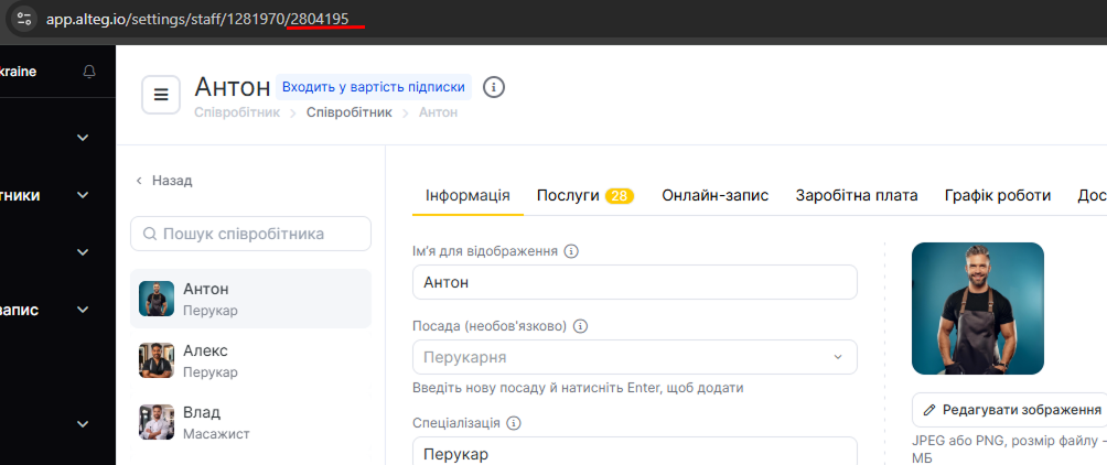 https://app.alteg.io/settings/master/name/XXXXXX/2804195/, де останні цифри 2804195 — це ID співробітника.