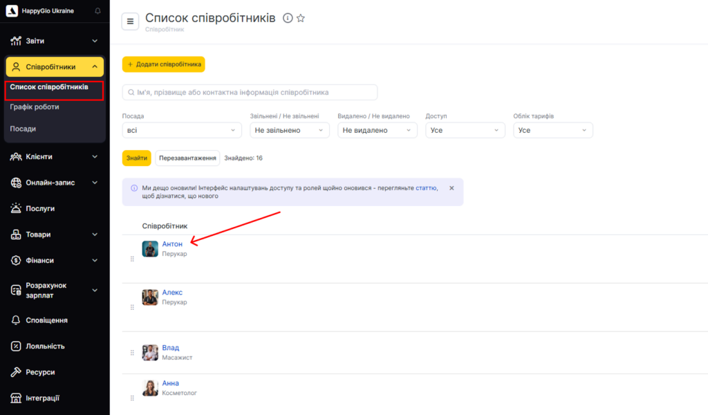 - Перейдіть у режим Адміністрація до розділу Співробітники > Список співробітників.