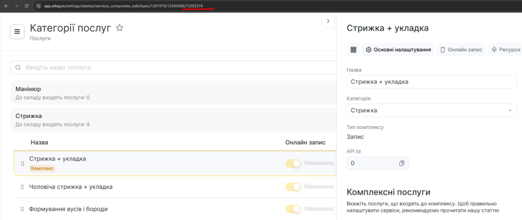 - В адресному рядку з’явиться посилання такого вигляду: https://app.alteg.io/settings/services_edit/basic/XXXXXX/ХХХХХХХХ/13383374/, де цифри 13383374 — це ID послуги.