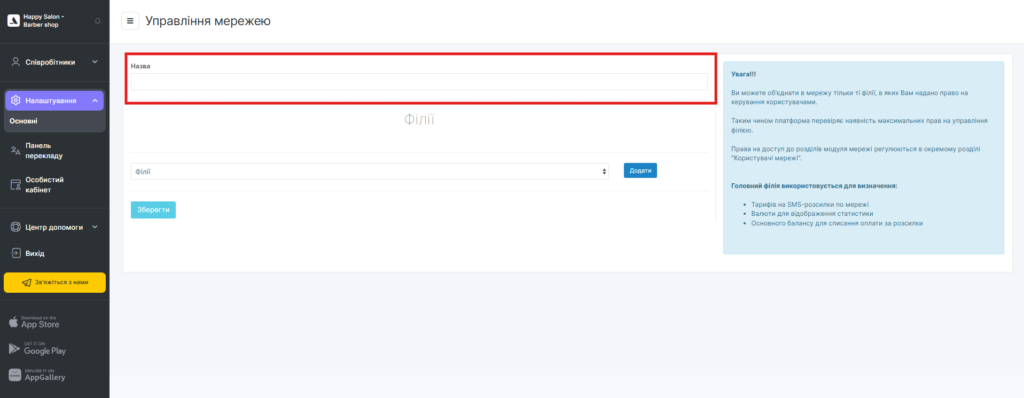 Altegio автоматично перенаправить вас на сторінку керування мережею в розділ Налаштування > Основні (у мережевому інтерфейсі).