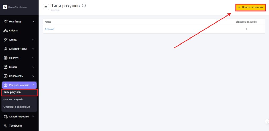 Відкрийте рахунок клієнту. У картці клієнта у філії (розділ Клієнти > Клієнтська база (у режимі Адміністрація) або блок Клієнт у вікні візиту (режим цифрового журналу) перейдіть у розділ Рахунки клієнта. Виберіть тип рахунку. За потреби вкажіть початковий баланс і співробітника, який відкриває рахунок. Натисніть Відкрити новий рахунок і проведіть оплату.