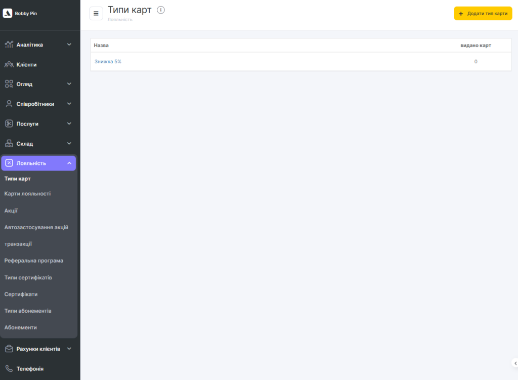 - У мережевому інтерфейсі перейдіть до розділу Лояльність > Типи карт та натисніть кнопку Додати тип карти.