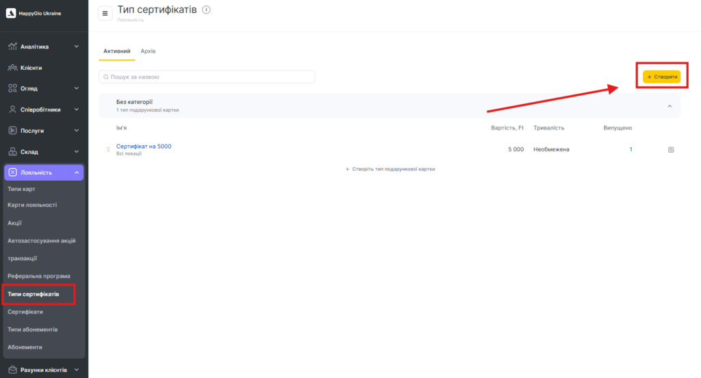 - У мережному інтерфейсі перейдіть до розділу Лояльність > Типи сертифікатів та натисніть кнопку Створити.