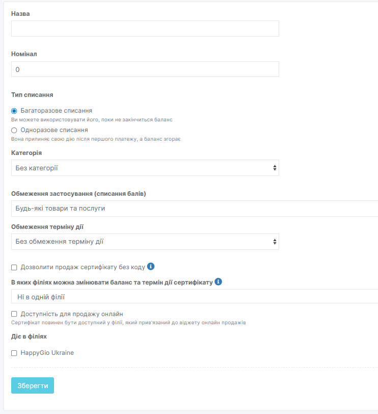 - На новій сторінці вкажіть назву типу сертифіката, наприклад, Сертифікат на 1000.