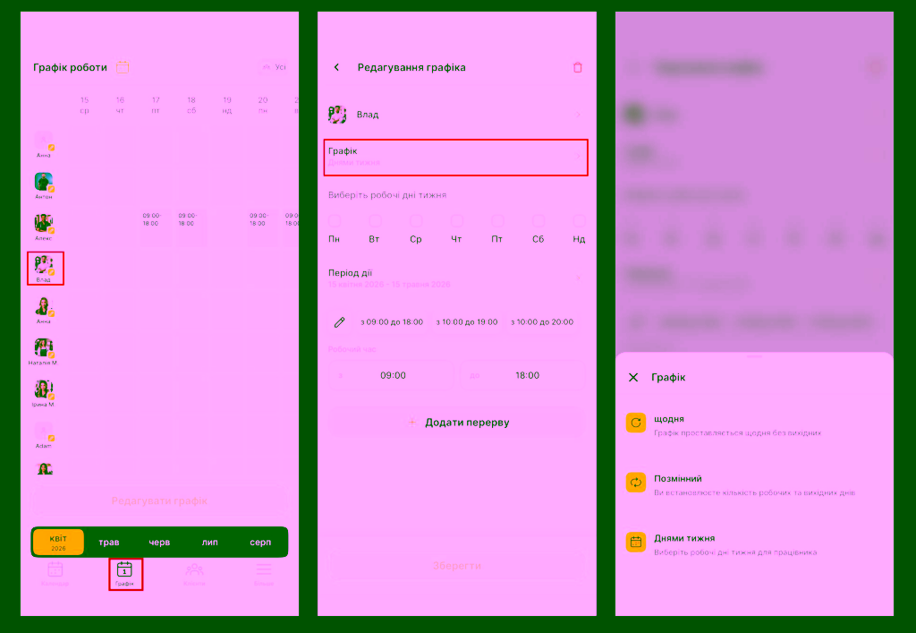 - Встановити розклад на заданий період часу: відкриється меню зміни графіка на період із розділу Графік.