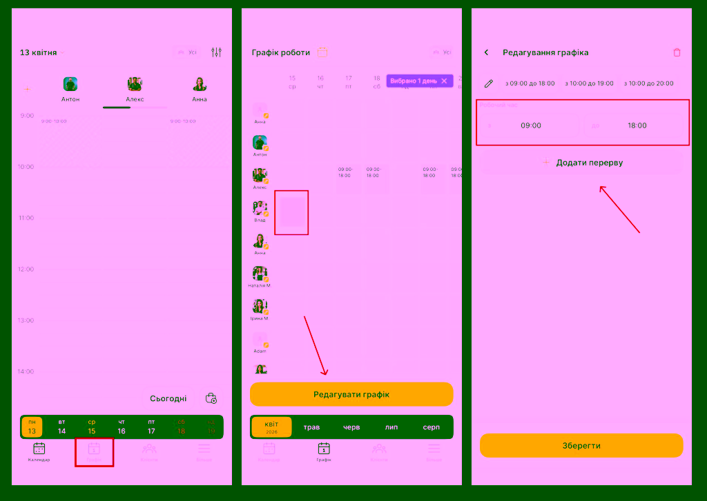 - Виділіть потрібні дати в календарі та натисніть кнопку Редагувати графік. Або натисніть на фото співробітника, якщо потрібно змінити графік конкретного співробітника.