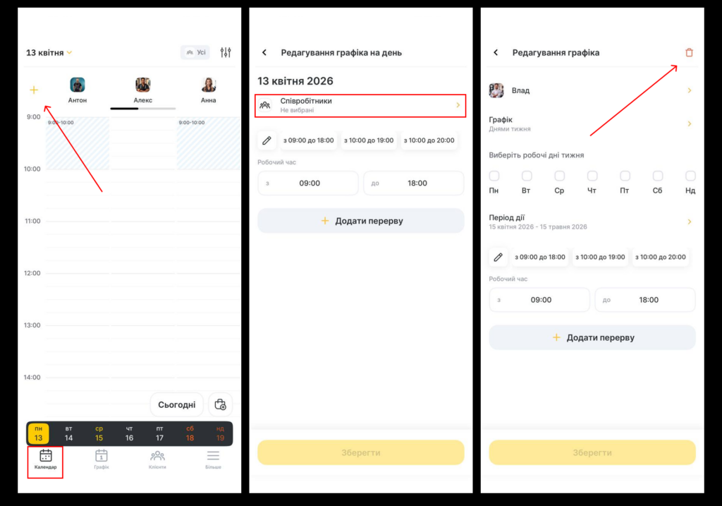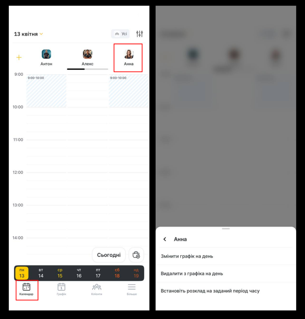 Після налаштування графіка роботи співробітник з’явиться в розкладі, і до нього можна буде почати записувати клієнтів. Якщо в налаштуваннях співробітника ви вказали, що він доступний для онлайн-запису, клієнти зможуть записуватися до нього самостійно.