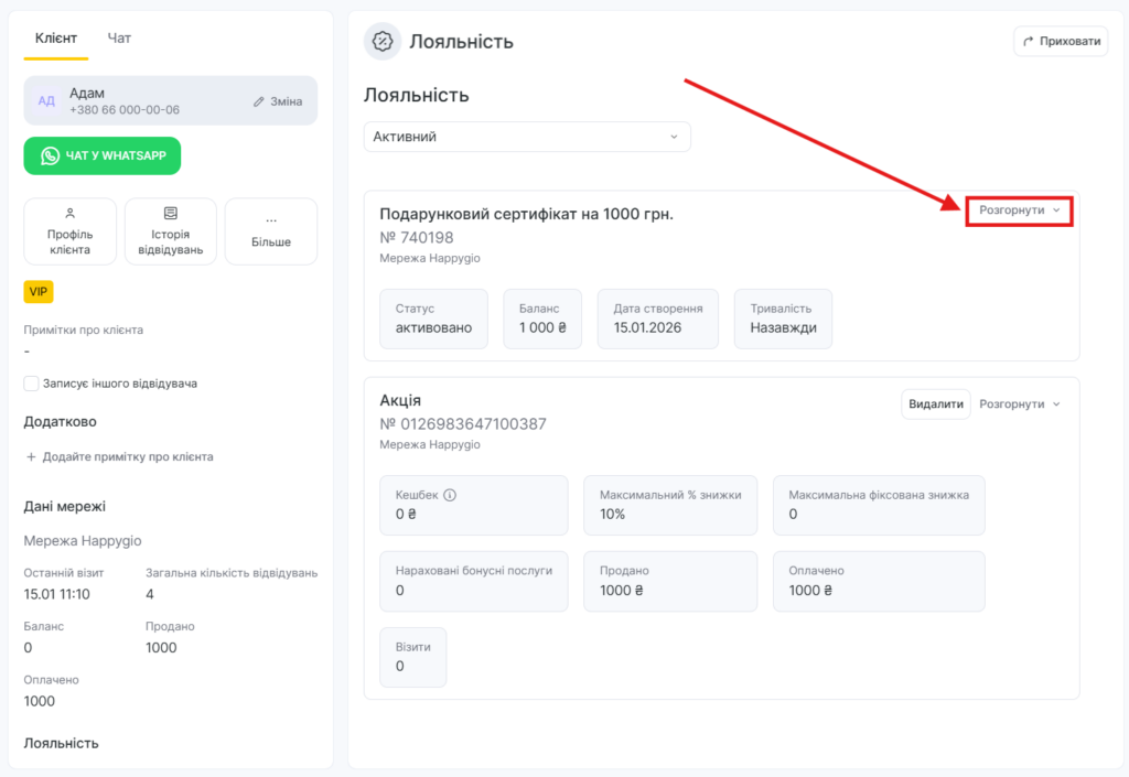 Дані абонемента можна переглянути на вкладці Лояльність у картці клієнта в клієнтській базі або в записі клієнта. Щоб перейти до деталей абонемента, натисніть Розгорнути.