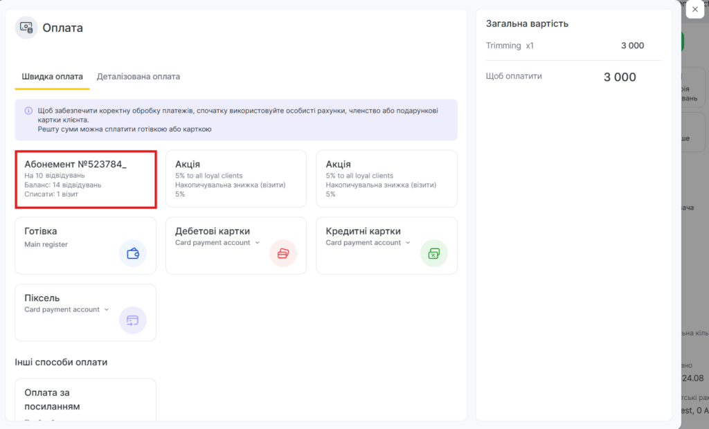 - Якщо абонемент відображається в картці клієнта в розділі Лояльність, то у вікні запису після переходу до оплати з’явиться кнопка «Абонемент №…».