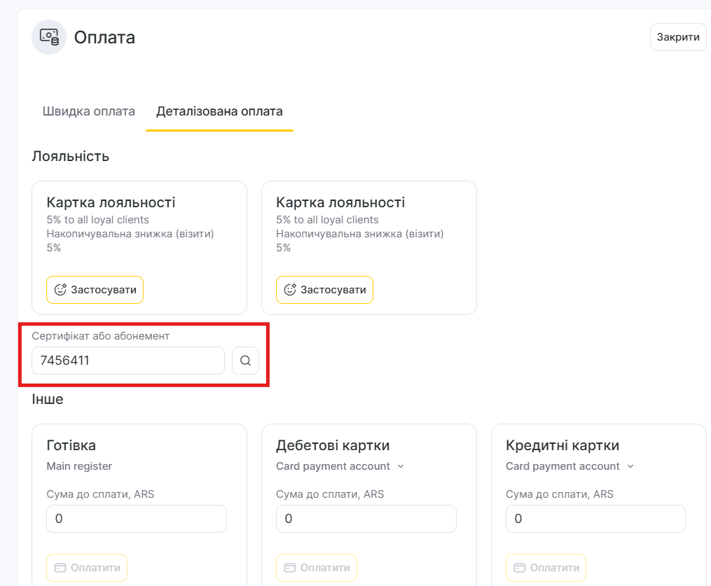Щоб знайти інший абонемент, прив’язаний до іншого клієнта, у полі Сертифікат або абонемент введіть код абонемента та натисніть кнопку пошуку .