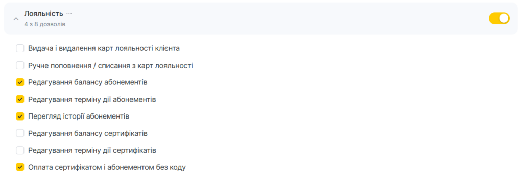 - Щоб співробітник міг редагувати баланс абонемента, необхідне право Лояльність > Редагування балансу абонементів.