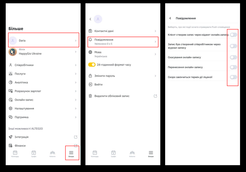 У системі Altegio користувачі можуть налаштовувати push-сповіщення в мобільному застосунку. Функція доступна на вкладці Повідомлення в налаштуваннях акаунта користувача.