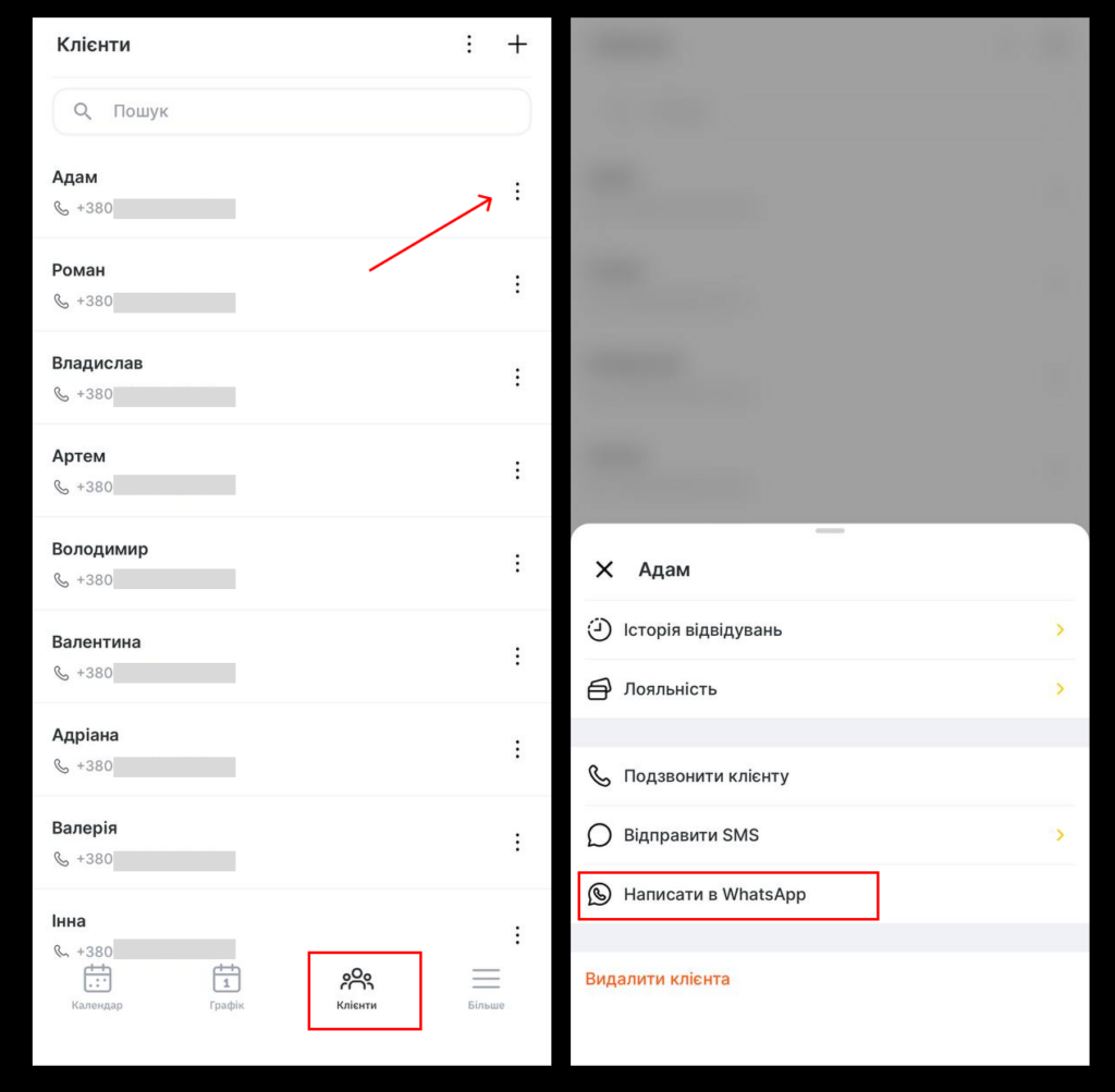 - Натисніть на меню з трьома крапками біля імені вибраного клієнта або в картці клієнта й оберіть пункт Написати в WhatsApp.