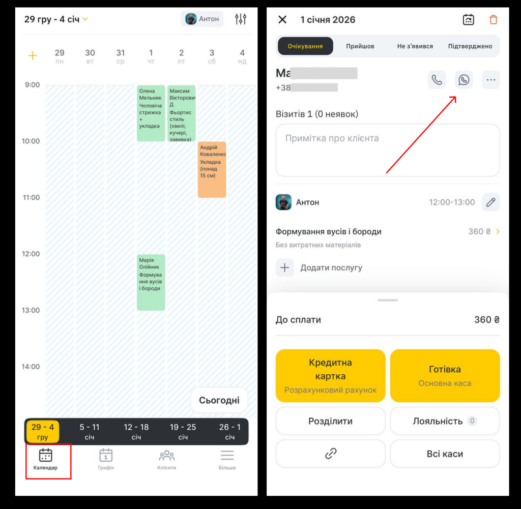 - У вікні запису натисніть кнопку з логотипом WhatsApp праворуч від імені клієнта.