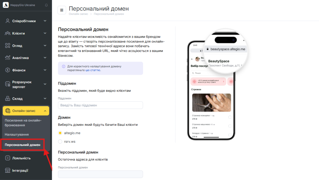Перейдіть у розділ Онлайн-запис > Персональний домен.