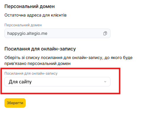 Цей функціонал дозволяє створити посилання на основі доменів, наданих Altegio (наприклад, altegio.me), а потім прив’язати його до одного з ваших існуючих посилань для онлайн-запису.